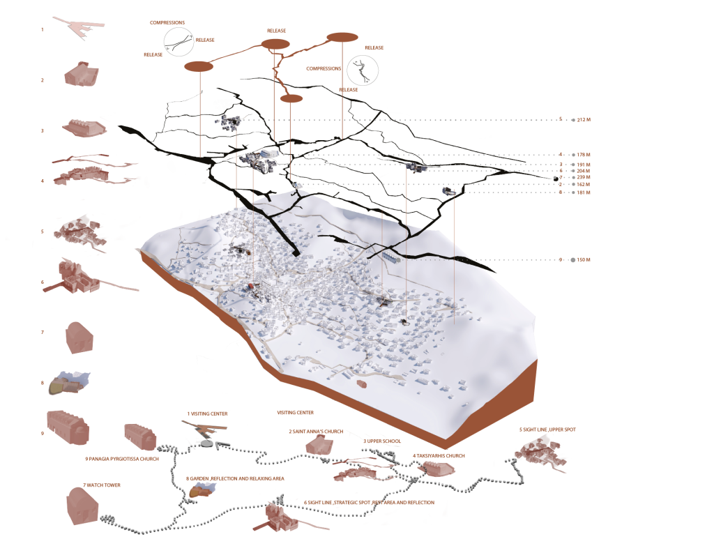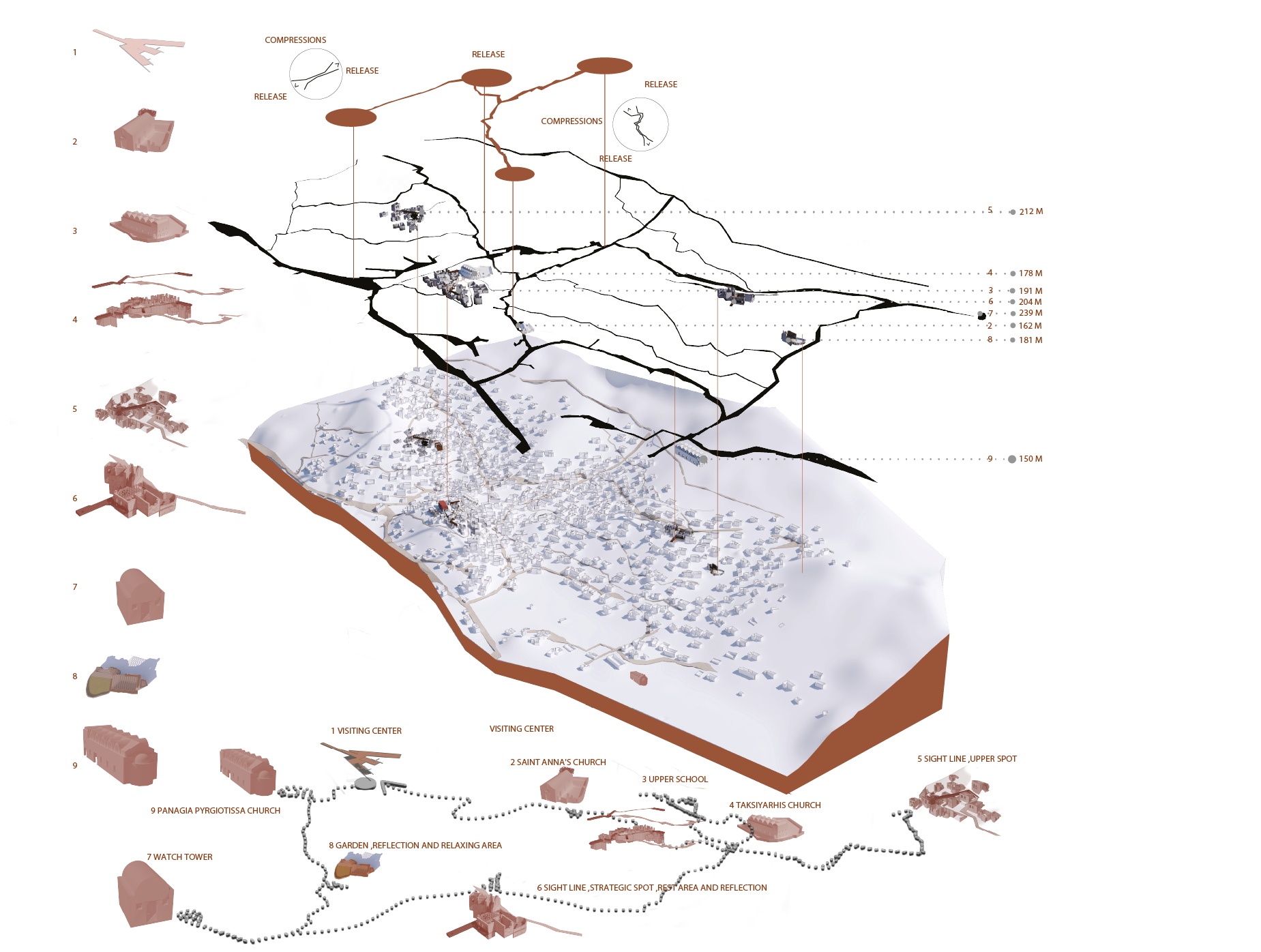 The existing roads and pathways are maintained and enhanced as thematic routes, offering moments of exploration, discovery, and reflection. Strategic vantage points—located in the middle, northwest, and southeast of the village—provide breathtaking views of the ruins and surrounding landscape. Subtle interventions, seamlessly integrated into the Mediterranean terrain, enrich this experience without overshadowing the historical context. These include transparent platforms that extend over and through the ruins, allowing visitors to engage physically and visually with the textures and layers of the village’s past.