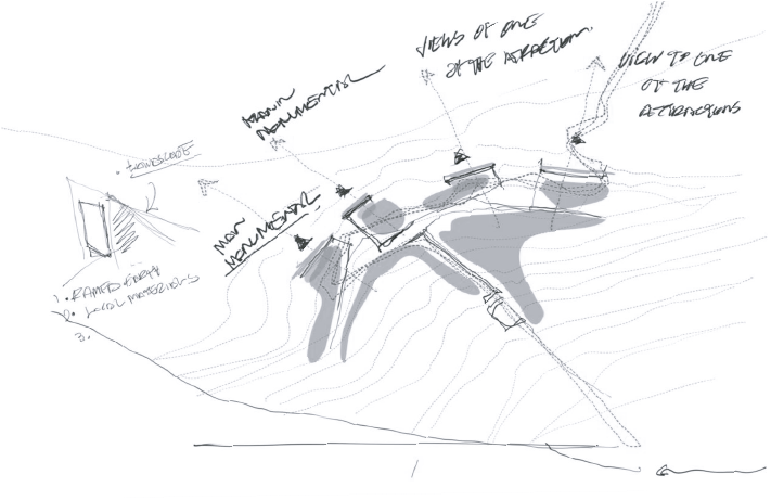 Each of these strategic spots is directly connected to another platform, forming a network that follows the patterns of the existing ruins in varying directions. As visitors traverse these paths, they experience an emotional and sensory journey, moving through moments of compression and release shaped by the ruins and rocky pathways. Along the way, they can touch, feel, and observe the textures and patterns of the site, engaging with its rich history on multiple levels. This immersive experience allows visitors to explore the ruins from different perspectives—through, on, and above the structures—while also appreciating the surrounding natural landscapes. Each platform culminates in a picturesque framed view, capturing the beauty of the ruins and their connection to the landscape.